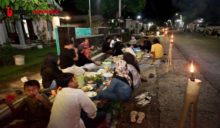 Warga dan pengunjung telah memadati kanan-kiri jalan raya sejak sebelum Magrib. Mereka duduk lesehan di pinggir jalan dengan hidangan lengkap yang siap disantap.