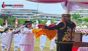 Upacara di IKN digelar di Lapangan Plaza Seremoni. Kalau tahun lalu langsung di lapangan utama yang persis di depan Istana Garuda. Basuki yang mengenakan rompi dan kopiah manik suku Dayak tampil sebagai inspektur upacara.