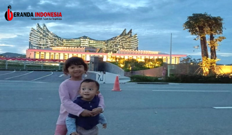 Cucu saya Jena dan Aby tanpa alas kaki bermain berlarian di jalan depan Istana. Kebetulan ibunya, putri saya, Aisyah Febria bekerja di Otorita IKN. “Mulus betul jalannya,” kata Jena kegirangan.