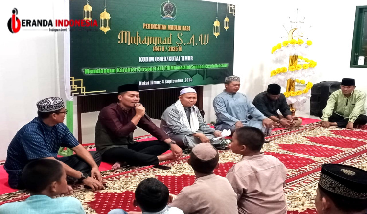 KUTAI TIMUR – Komandan Kodim 0909/Kutai Timur, Letkol ARH Ragil Setyo Yulianto, menghadiri acara peringatan Maulid Nabi Muhammad SAW 1447 Hijriah tahun 2025 di Mushola As Shobirin, Jalan Jenderal Sudirman Desa Sangatta Utara, Kecamatan Sangatta Utara, Kabupaten Kutai Timur, Kamis (4/9/2025).