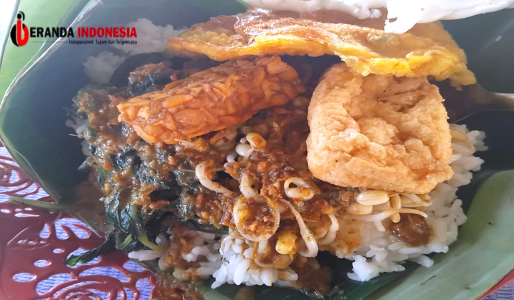 Ciri khas nasi pecel ini, dibungkus dengan daun pisang hijau yang dibentuk menyerupai limas.