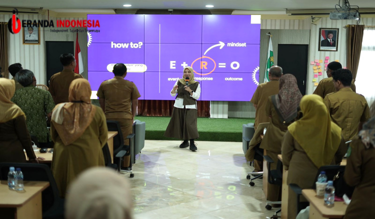 Foto ini menggambarkan suasana pelatihan atau workshop yang diselenggarakan oleh UPTD Tekkom Infodik dengan suasana aktif dan interaktif. Pemateri tampak menyampaikan materi dengan semangat di depan peserta yang terdiri dari pegawai berseragam dinas, menandakan kegiatan resmi pemerintah. Tampilan layar besar di belakang menunjukkan konsep “E + R = O (Event + Response = Outcome)”, yang menekankan pentingnya mindset dan respons positif dalam menghadapi perubahan.