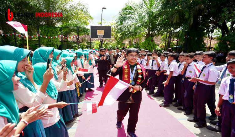 Wakil Bupati Banyuwangi, Mujiono, memberikan ucapan selamat secara langsung kepada Reyno pada acara penyambutan dan pemberian apresiasi yang digelar oleh MTsN 3 Banyuwangi, Kamis (4/12/2025). Acara tersebut juga dikuti ratusan teman sekolahnya yang ikut bangga dengan prestasinya.