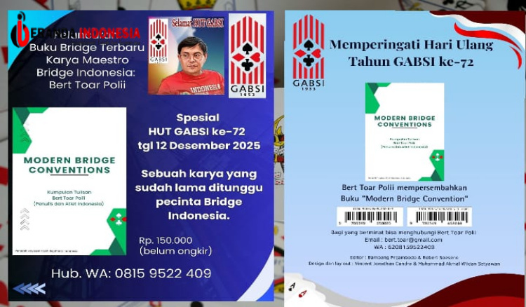JAKARTA – Buku bridge berjudul Modern Bridge Convention karya Bert Toar Polii resmi terbit pada 13 Desember 2025, sehari setelah peringatan Hari Ulang Tahun Gabungan Bridge Seluruh Indonesia (GABSI) ke-72. Buku tersebut dipersembahkan penulis sebagai hadiah khusus bagi GABSI pada momentum ulang tahun organisasi bridge nasional tersebut.