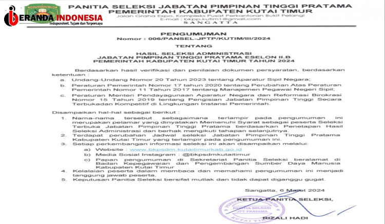 Ini Peserta JPTP Pemkab Kutim yang Lulus Seleksi Administrasi
