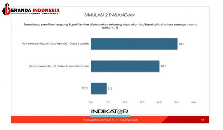 Survei Indikator Pilbup Jember, Gus Fawait-Djoko 50,7%, Hendy-Firjaun 40,1%