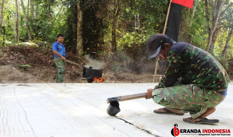 Anggota Satgas TMMD Lapisi Sambungan Semenisasi Jalan dengan Cairan Aspal